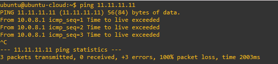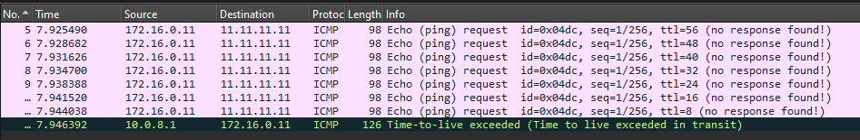 Pada Gambar 6, kita melakukan Ping ke IP 11.11.11.11. IP tersebut tidak ada dalam topologi kita. Akan tetapi karena static route 0.0.0.0/0, maka setiap Router terus mentransmisikan packet Ping tersebut ke Router selanjutnya sampai TTL pada packet menjadi 0. Kemudian kita melakukan packet capture pada salah satu Router, yaitu pada Gambar 7. Pada kolom info kita bisa melihat TTL pada packet terus berkurang karena packet tersebut terus diputar dari Router ke Router sampai terjadi TTL Exceeded.