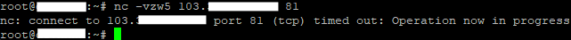 Selanjutnya kita meng-scan port 81 ke IP target yang sama. Ketika command dijalankan, ada delay selama 5 detik, lalu kemudian informasi “time out” ditampilkan. Ini karena tidak ada respon dari target selama 5 detik, sehingga Netcat menganggap koneksi ke target adalah timeout. Ini bisa disebabkan oleh firewall yang mem-block port tersebut, atau target dikonfigurasi untuk hanya diam dan tidak memberikan respon apa-apa saat ada packet yang sampai ke port tersebut.