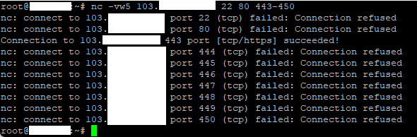 Netcat bisa melakukan scan ke lebih dari 1 port. dan juga port range dengan menggunakan 1 baris command saja. Pada contoh di atas, kita melakukan port scanning ke port 22, 80, dan 443 sampai 450.